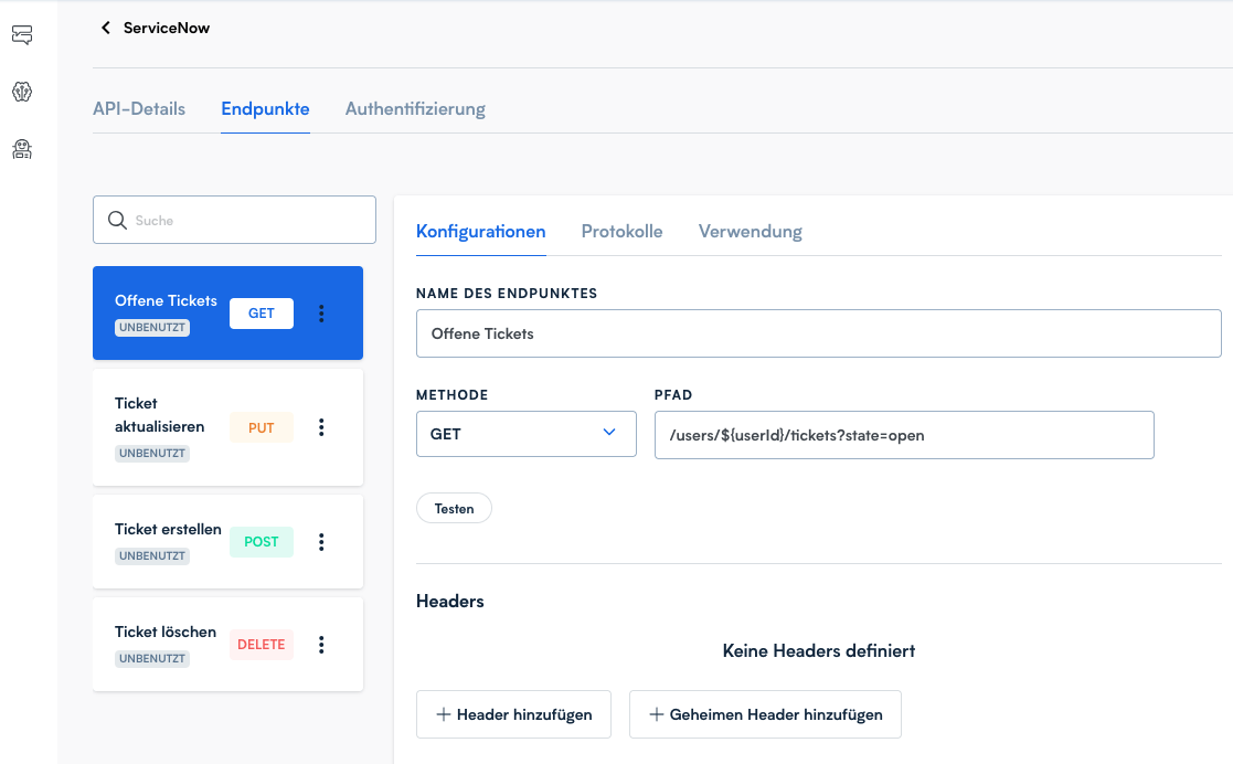 Spezielle Request-Header für diesen Endpunkt können ebenfalls hier definiert werden. Wenn Header auf Endpunkt- und API-Ebene den gleichen Namen haben, überschreiben die Endpunkt-Header die globalen API-Header.