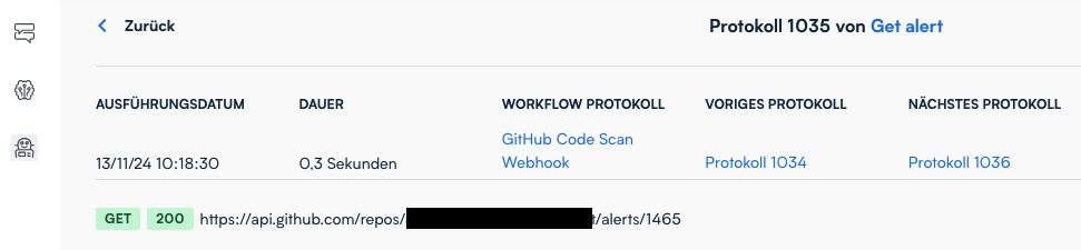Im oberen Bereich des Protokolls sehen Sie das Ausführungsdatum und die Dauer des Aufrufs. Links ermöglichen den direkten Sprung zum Workflow-Protokoll, in dem dieser Aufruf stattgefunden hat. Die Navigation zum vorherigen bzw. nächsten Protokoll ist ebenfalls möglich.