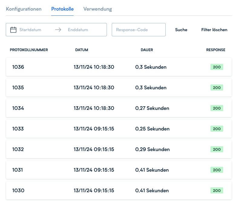 Der Reiter *Protokoll* zeigt Ihnen wie oft dieser Endpunkt verwendet wurde. Neben dem Datum und der Ausführungszeit wird auch der Response-Code des Aufrufs angezeigt. Beim Klick auf einen Eintrag dieser Liste, werden Details angezeigt.