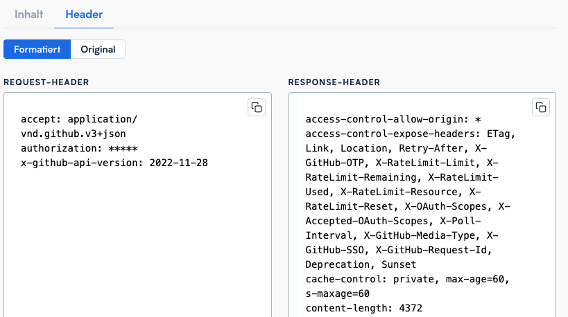 Beim Klick auf *Header* werden Request- und Responser-Header angezeigt.