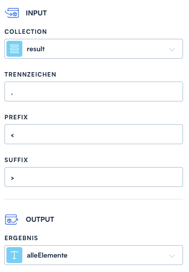 Mit dem Plugin <img src="https://2388870224-files.gitbook.io/~/files/v0/b/gitbook-x-prod.appspot.com/o/spaces%2F8dtLKppxVG0mxVBzNFs6%2Fuploads%2FQp90oPlcigKKz4fSBiow%2Fplugin-join-elements-01.png?alt=media&#x26;token=a95ce052-5e01-4073-aaff-fc5e781ec306" alt="" data-size="line"> *Elemente zusammenhängen* können alle Elemente in einer Collection zusammengehängt und in einer Variable vom Typ `text` gespeichert werden.