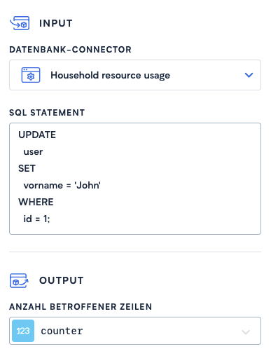 Mit dem Plugin <img src="https://2388870224-files.gitbook.io/~/files/v0/b/gitbook-x-prod.appspot.com/o/spaces%2F8dtLKppxVG0mxVBzNFs6%2Fuploads%2FKkeR5GuYbU6KUDqJ4S1X%2Fplugin-update-database-01.png?alt=media&#x26;token=a53aa8df-4455-48fa-b7e4-01b3143d636d" alt="" data-size="line"> *Datenbank aktualisieren* können Sie Daten in einer Datenbank bearbeiten. Es stehen die SQL-Standardmethoden `INSERT`, `UPDATE` und `DELETE` zur Verfügung.