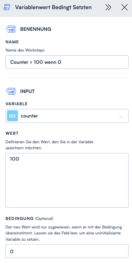 <figure><img src="https://2388870224-files.gitbook.io/~/files/v0/b/gitbook-x-prod.appspot.com/o/spaces%2F8dtLKppxVG0mxVBzNFs6%2Fuploads%2FQRpttTSFilXEUE6hvjAR%2Fplugin-set-variable-conditionally-04.png?alt=media&#x26;token=bbfc4c52-e991-435c-afac-0dd8f8c72b16" alt=""><figcaption><p>Setzen der Variable "counter" auf 100 wenn der aktuelle Wert 0 ist</p></figcaption></figure>