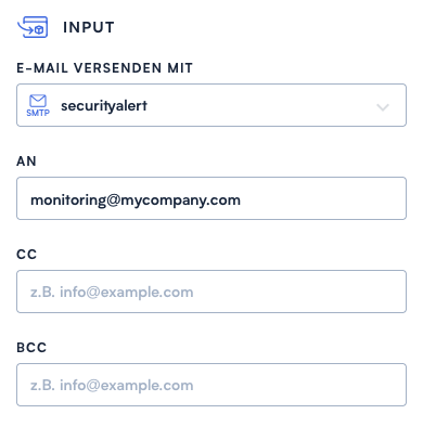 Hier legen Sie die Empfänger der E-Mail fest. Die Empfängeradressen können entweder als Freitext eingegeben oder über eine Variable referenziert werden. Um die E-Mail an mehrere Empfänger zu senden, trennen Sie die Adressen mit einem `;`.