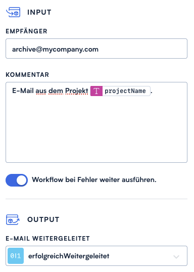 Kann die E-Mail nicht weitergeleitet werden, bricht der Workflow standardmäßig ab. Ist jedoch die Option *Workflow bei Fehler weiter ausführen* aktiviert, wird der Workflow fortgeführt und mit einer Warnung abgeschlossen.