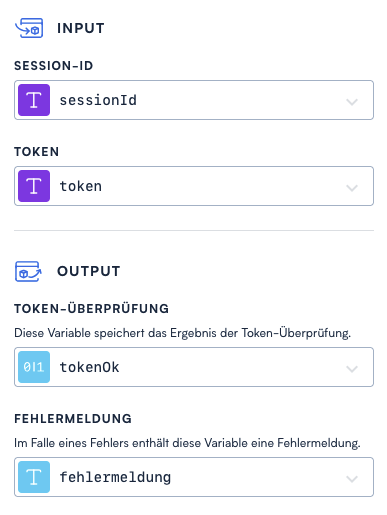 Wählen Sie die Variable aus welche den vom Benutzer eingegebenen Token beinhaltet. Es wird überprüft, ob dieser Token zur Session-ID passt. Bei einer Übereinstimmung wird die Session als authentifiziert gekennzeichnet. Eine Session bleibt für maximal 60 Minuten gültig.